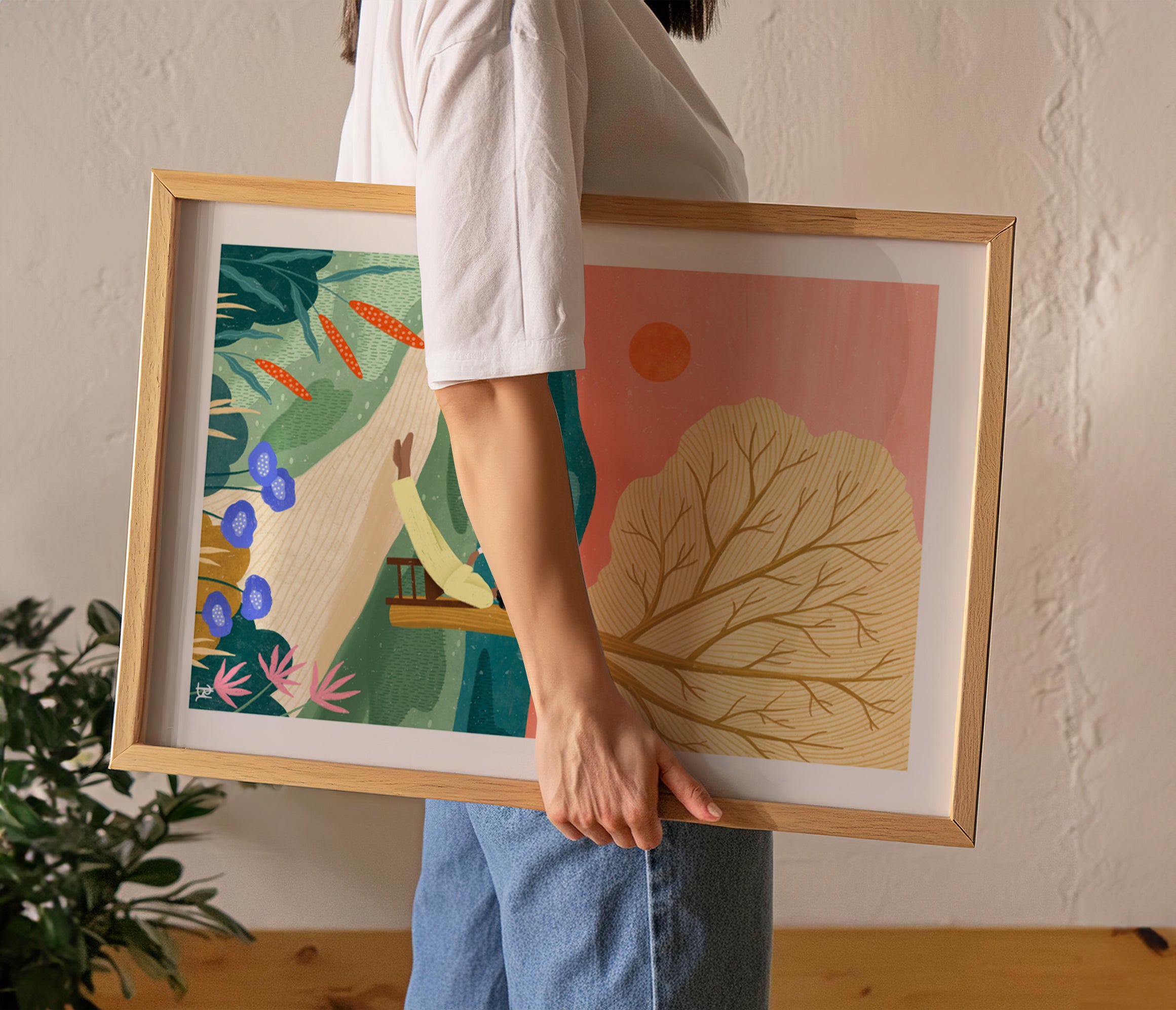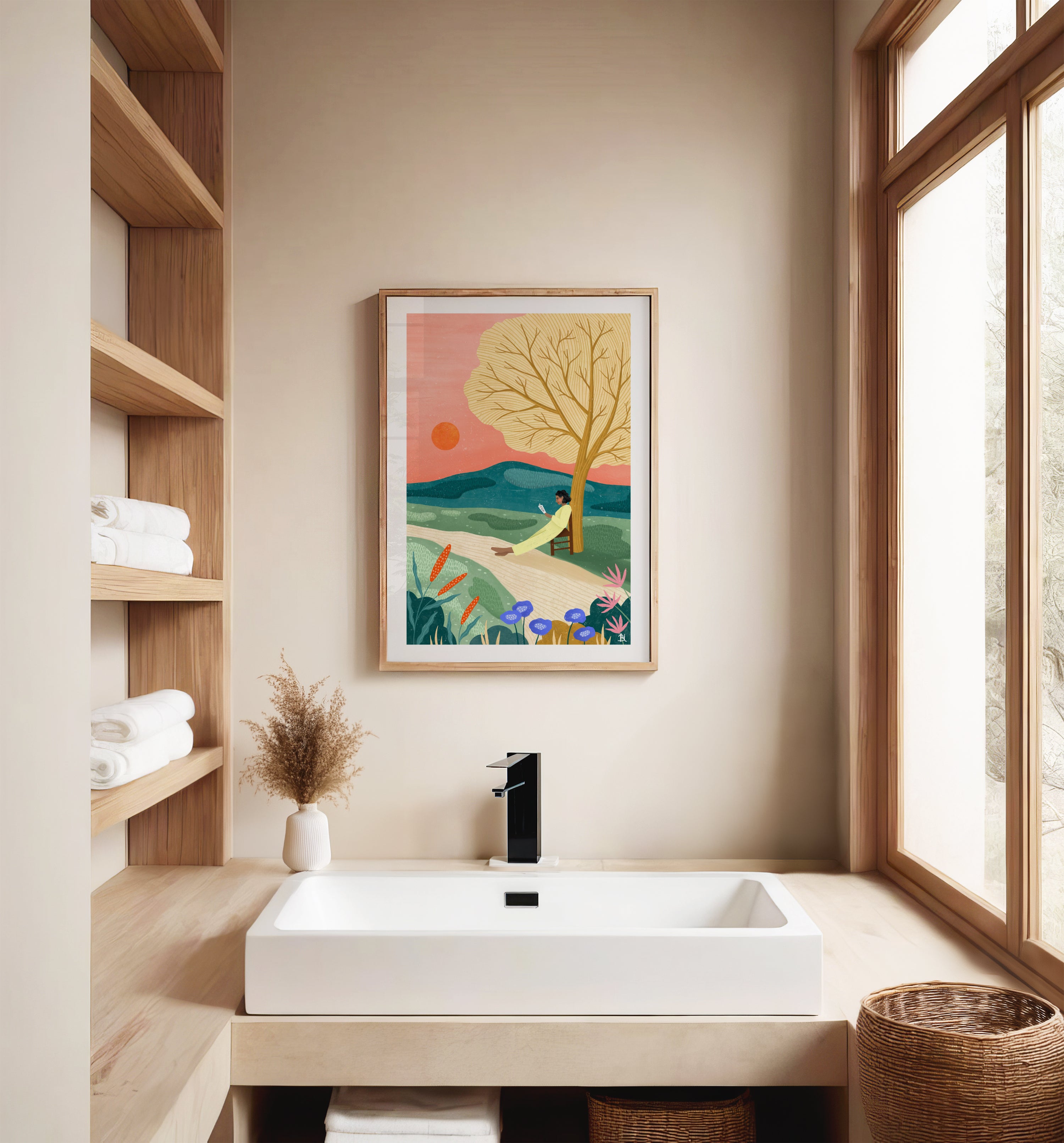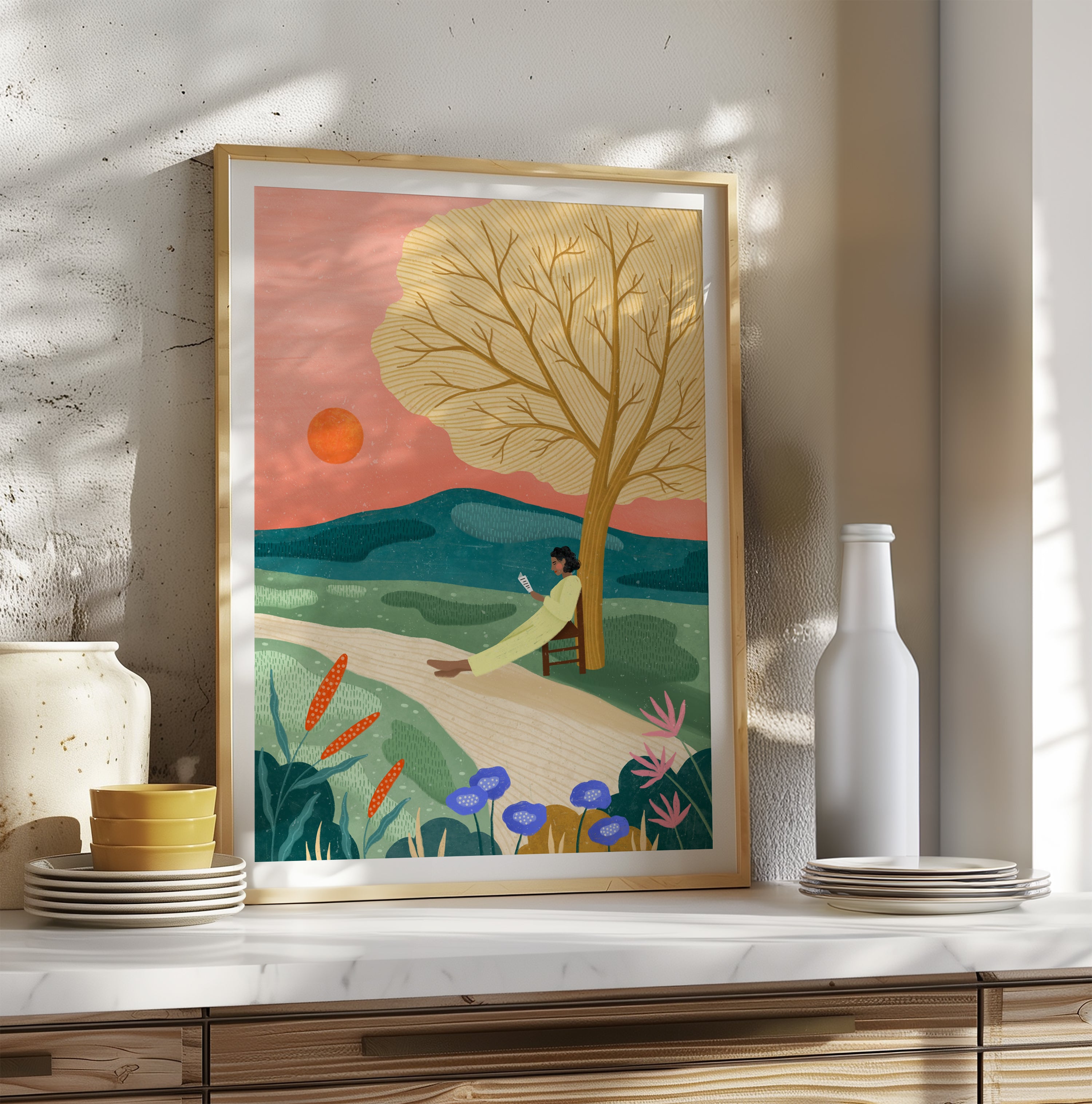 Designed with a white border to make framing easy and stylish, this high-quality art print is printed on durable, premium paper to ensure vivid colors and longevity. The artwork's lively palette and peaceful scene make it an ideal addition to eclectic, boho, or modern interiors, inspiring daily moments of mindfulness and adventure.