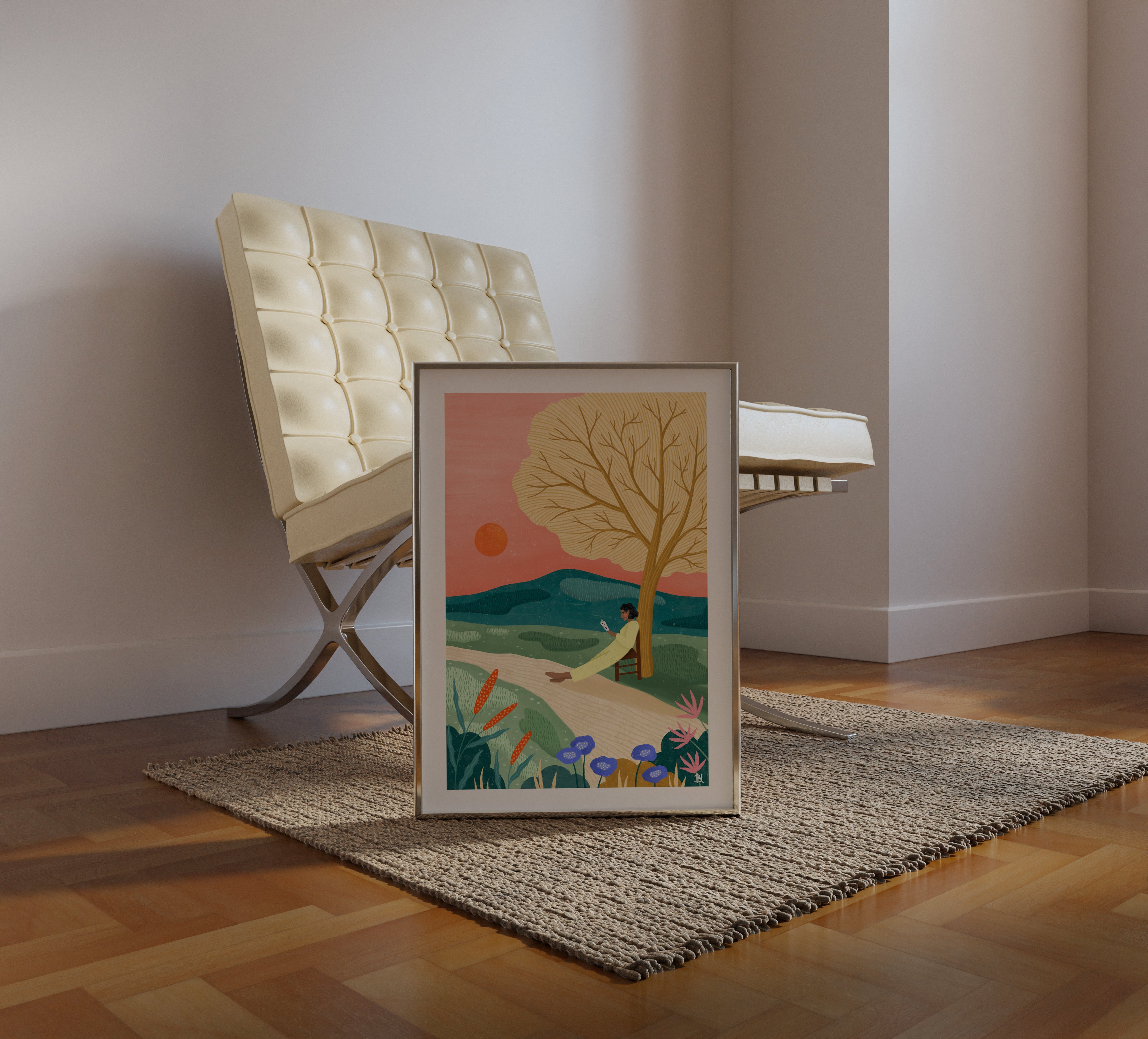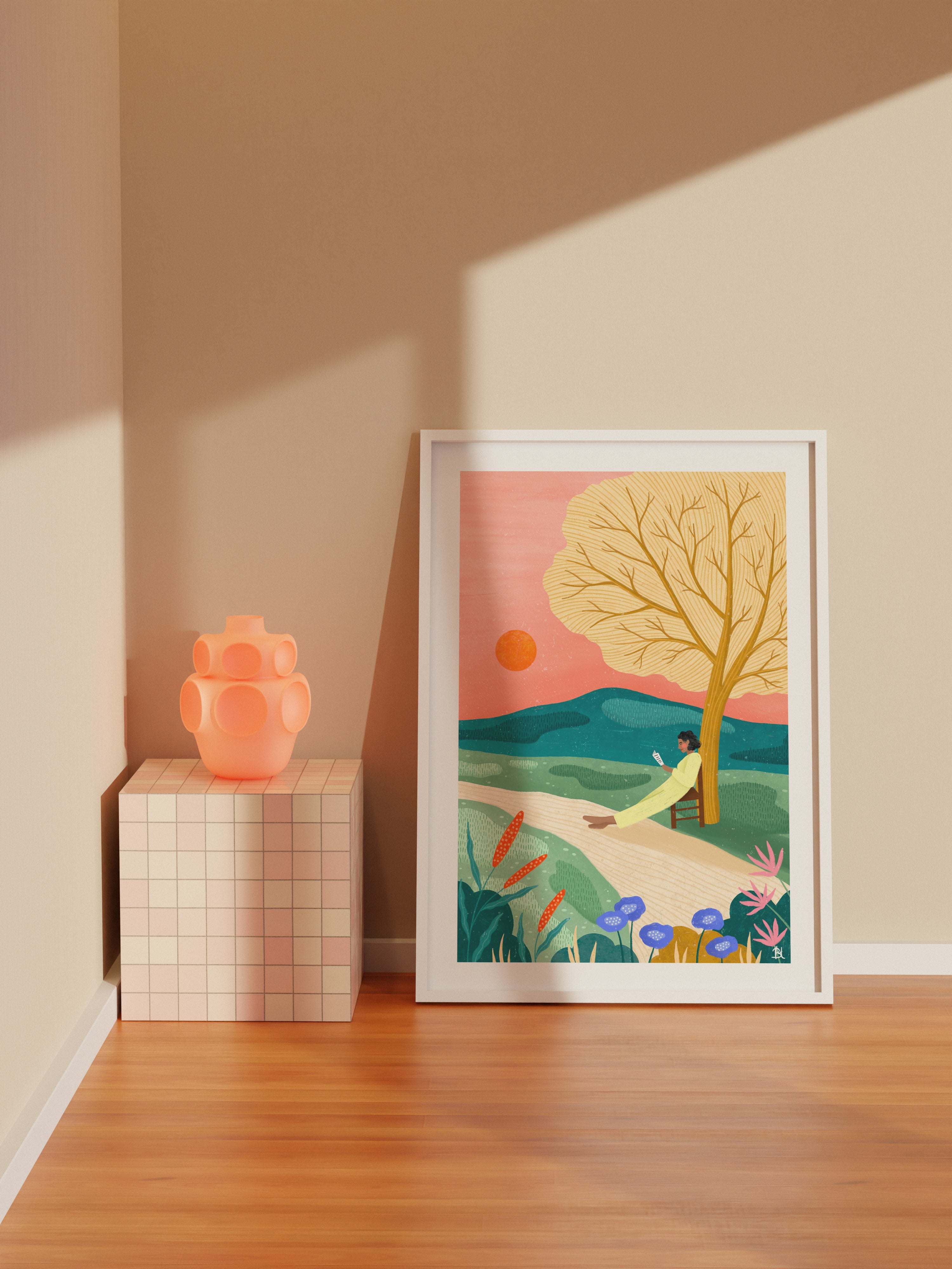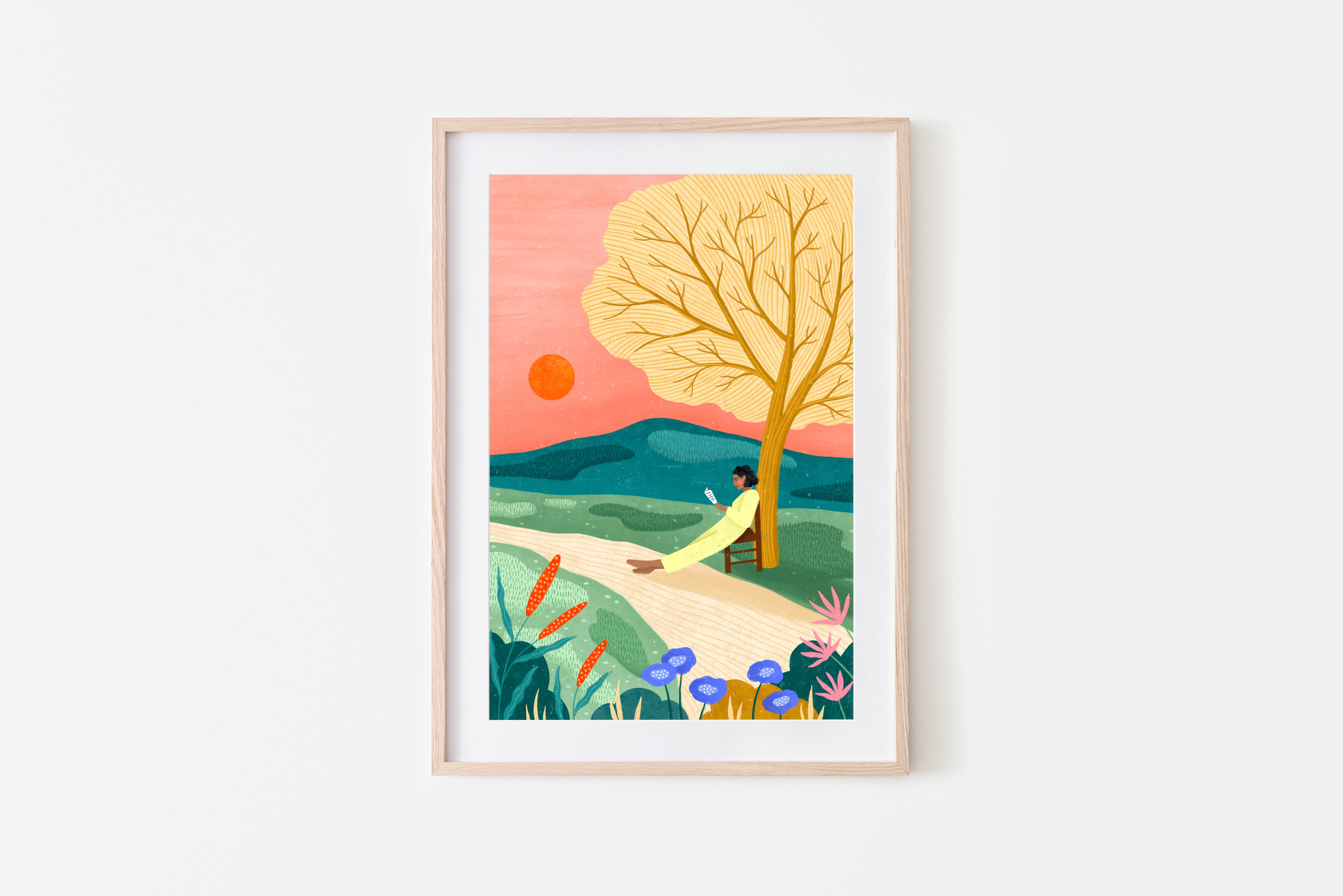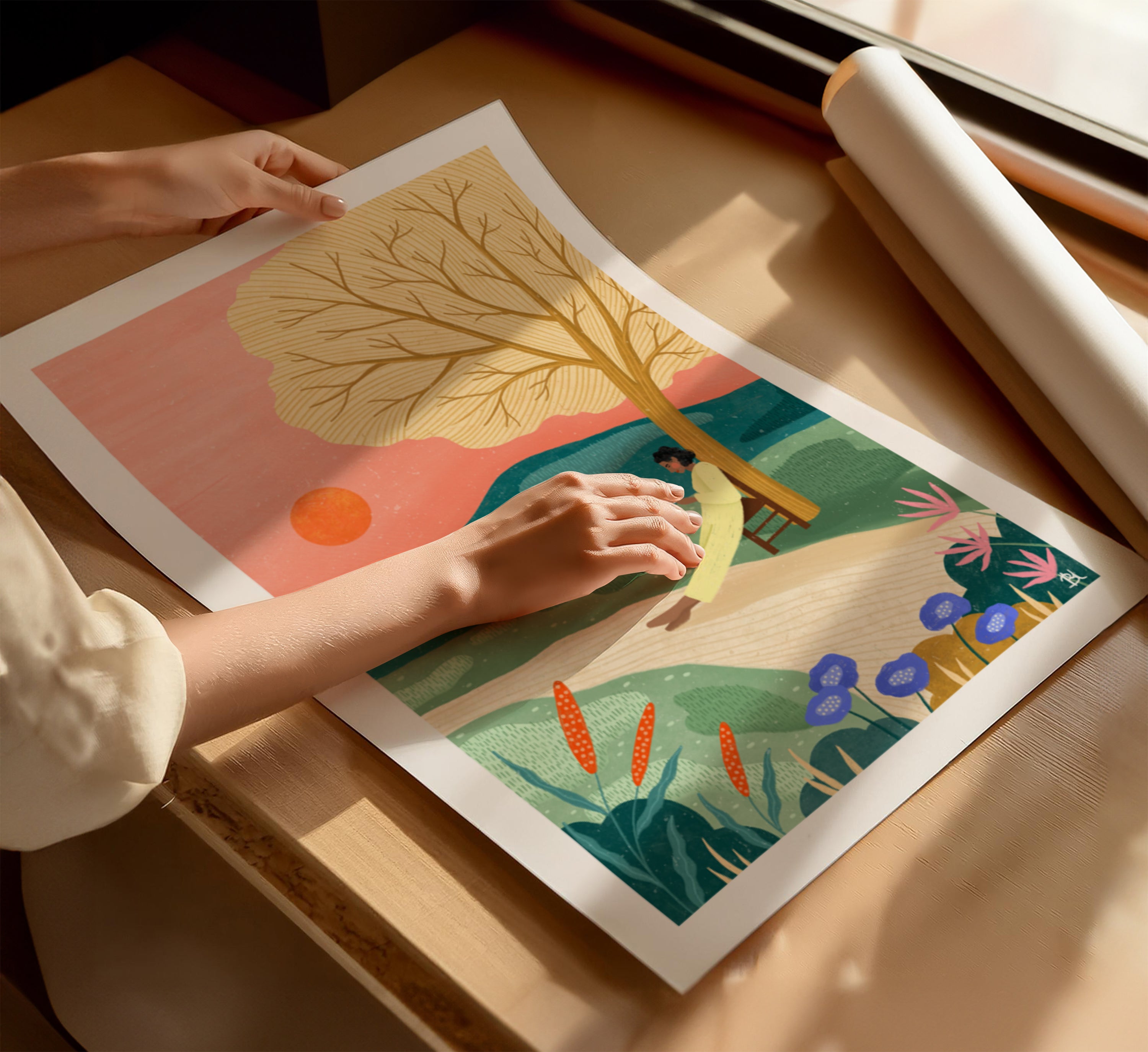Designed with a white border to make framing easy and stylish, this high-quality art print is printed on durable, premium paper to ensure vivid colors and longevity. The artwork's lively palette and peaceful scene make it an ideal addition to eclectic, boho, or modern interiors, inspiring daily moments of mindfulness and adventure.